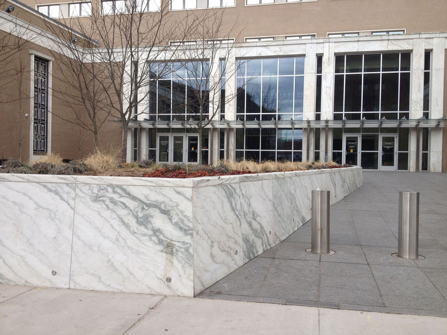 The U.S. General Services Administration tasked Robert Siegel Architects, as part of our GSA Region 1 IDIQ contract, to reconceive the public and staff entrances to the existing Abraham A. Ribicoff Federal Building and Courthouse. Since its initial construction in 1963, the entry courtyard paving had failed, the trees and vegetation had been removed, and an improvised concoction of large concrete obstacles had been installed to provide security from vehicle attacks. On the street, once-small trees had grown unchecked, thus unceremoniously obscuring the building and creating unsafe areas concealed from view.